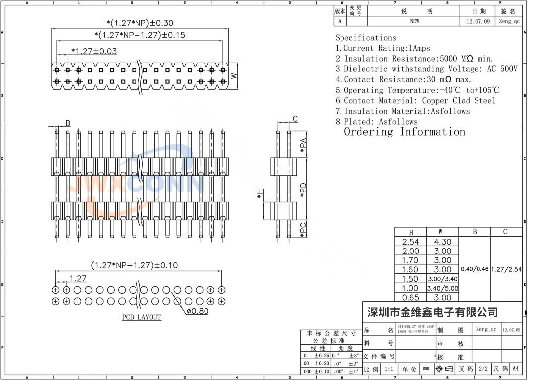 1.27mm间距 单排双塑 180度