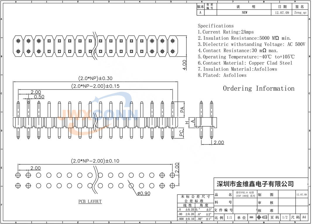 2.0mm间距 双排 180度